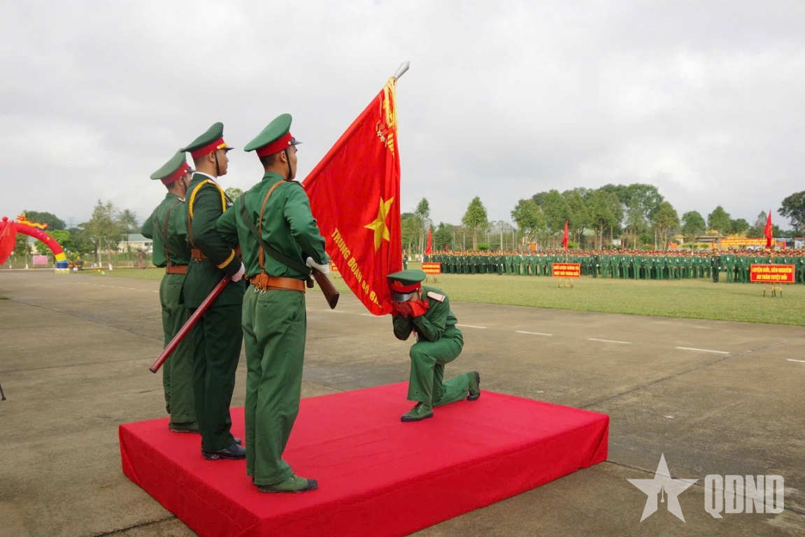 Chiến sĩ xuất ngũ năm 2026 của Trung đoàn 19 thực hiện nghi thức hôn Quân kỳ.