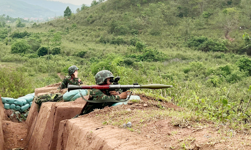 Chiến sĩ Trung đoàn 2 sử dụng súng B41 thực hành tiêu diệt mục tiêu xe tăng địch.