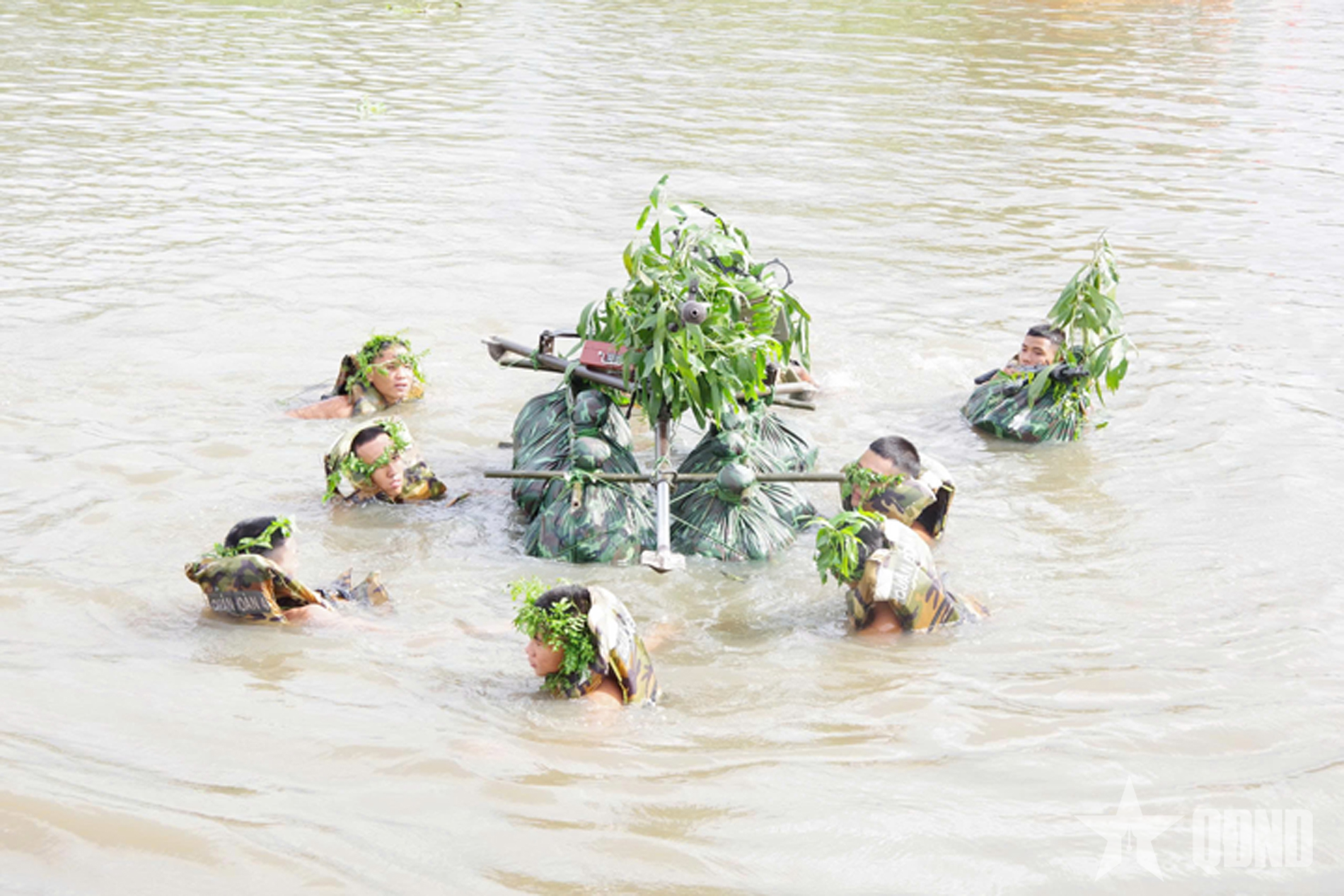 Cán bộ, chiến sĩ Trung đoàn 2 thực hành tình huống vượt sông trong diễn tập.