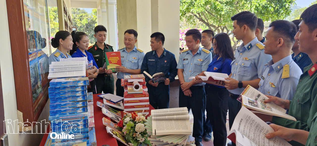 Cán bộ, chiến sĩ trung đoàn và đoàn viên, thanh niên đơn vị kết nghĩa tham quan khu vực trưng bày sách.