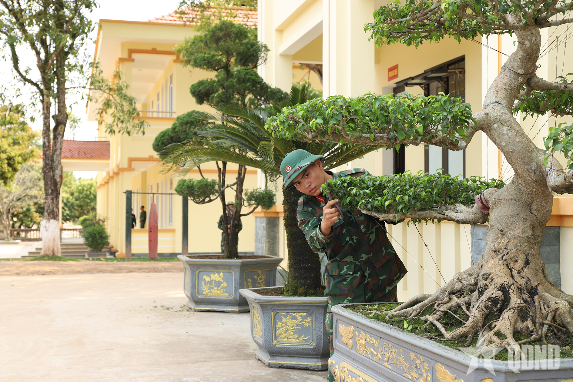 Chiến sĩ Trung đoàn 43 chăm sóc bồn hoa, cây cảnh trong khuôn viên đơn vị.