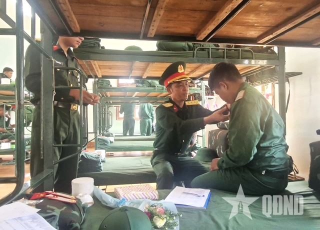 Chỉ huy Trung đoàn 584 tặng hoa, chúc mừng chiến sĩ mới về đơn vị.