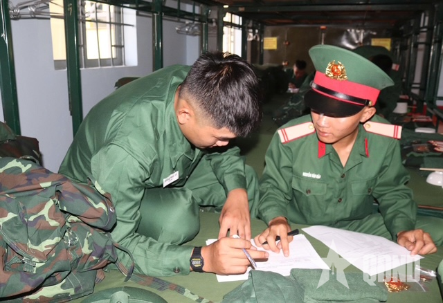 Cán bộ Tiểu đội nắm bắt thông tin cá nhân của chiến sĩ mới.