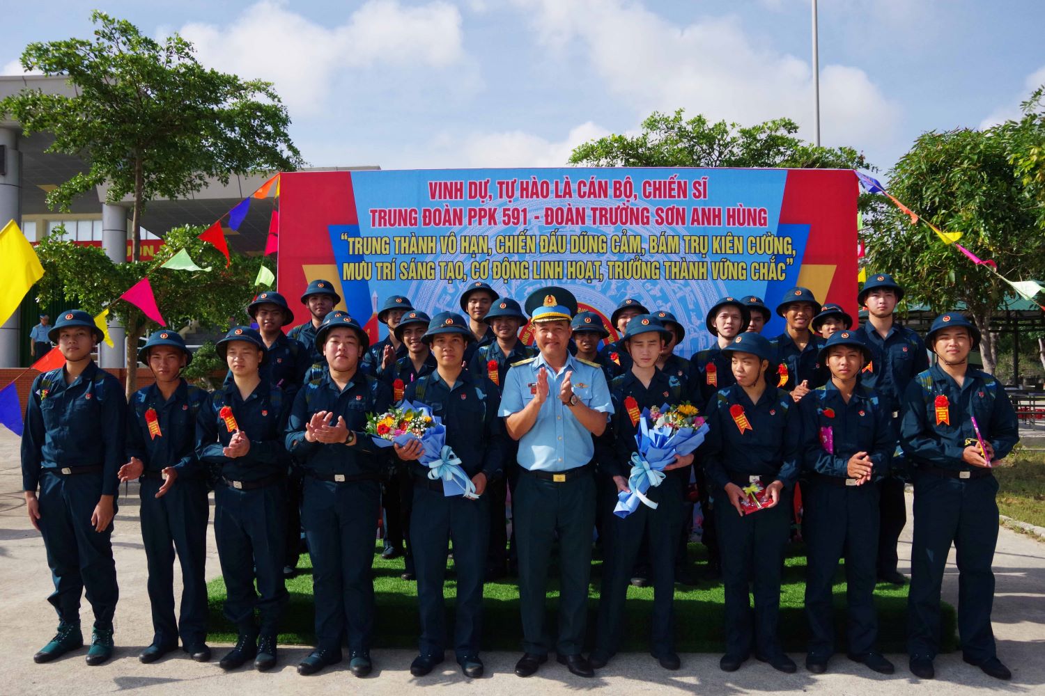 Lãnh đạo Trung đoàn 591 chụp ảnh lưu niệm cùng các chiến sĩ mới.