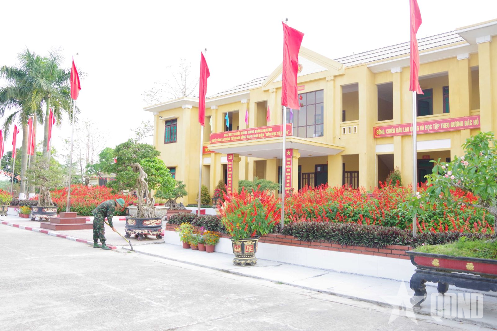 Cán bộ, chiến sĩ tập trung chỉnh trang lại đơn vị.