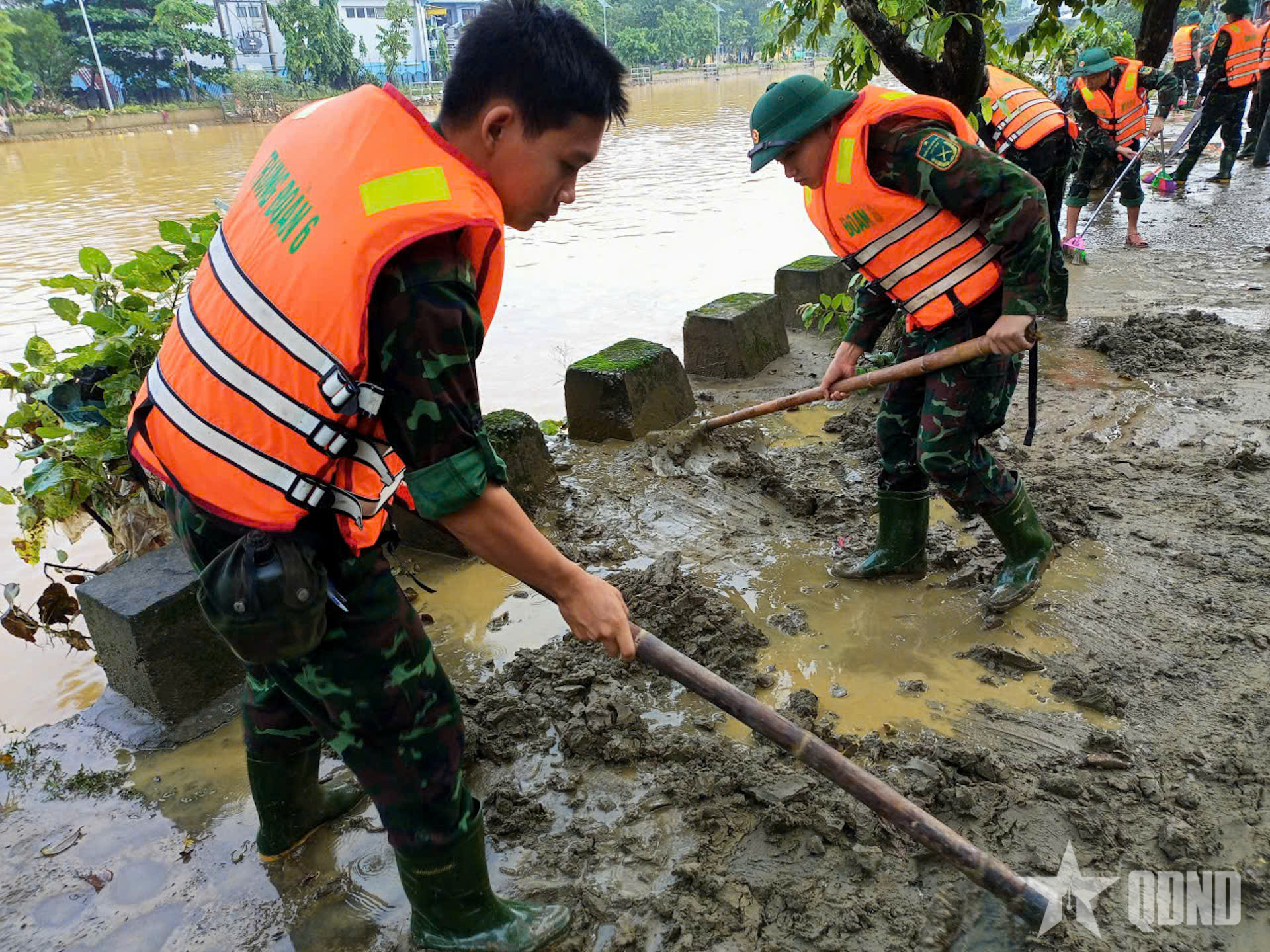 Sáng 7-11, trên các con đường Hải Triều, Phan Anh, Nguyễn Duy Trinh vẫn còn ngổn ngang bùn đất, hơn 70 cán bộ, chiến sĩ đang lao động cật lực. Đại úy Mai Cao Phát, Phó tiểu đoàn trưởng Tiểu đoàn 1, Trung đoàn 6 cơ động hết đường Hải Triều, qua Phan Anh đến Nguyễn Duy Trình vừa động viên anh em tranh thủ trời nắng khẩn trương dọn dẹp, vừa nhắc anh em bảo đảm an toàn và không được làm ảnh hưởng việc đi lại, sinh hoạt của người dân.