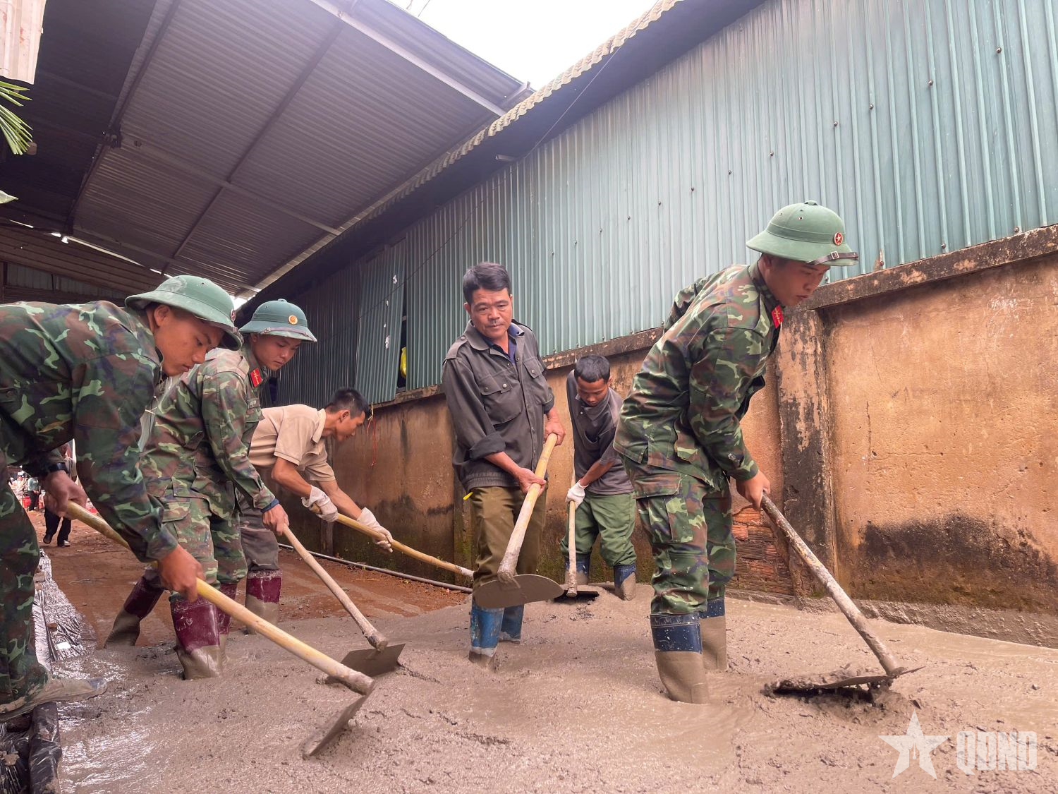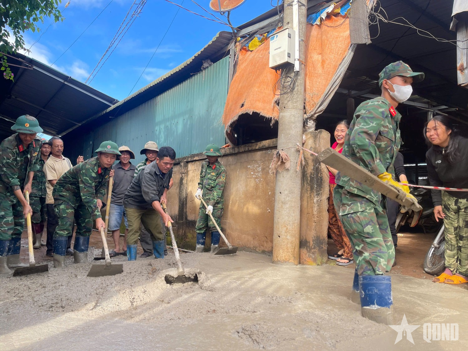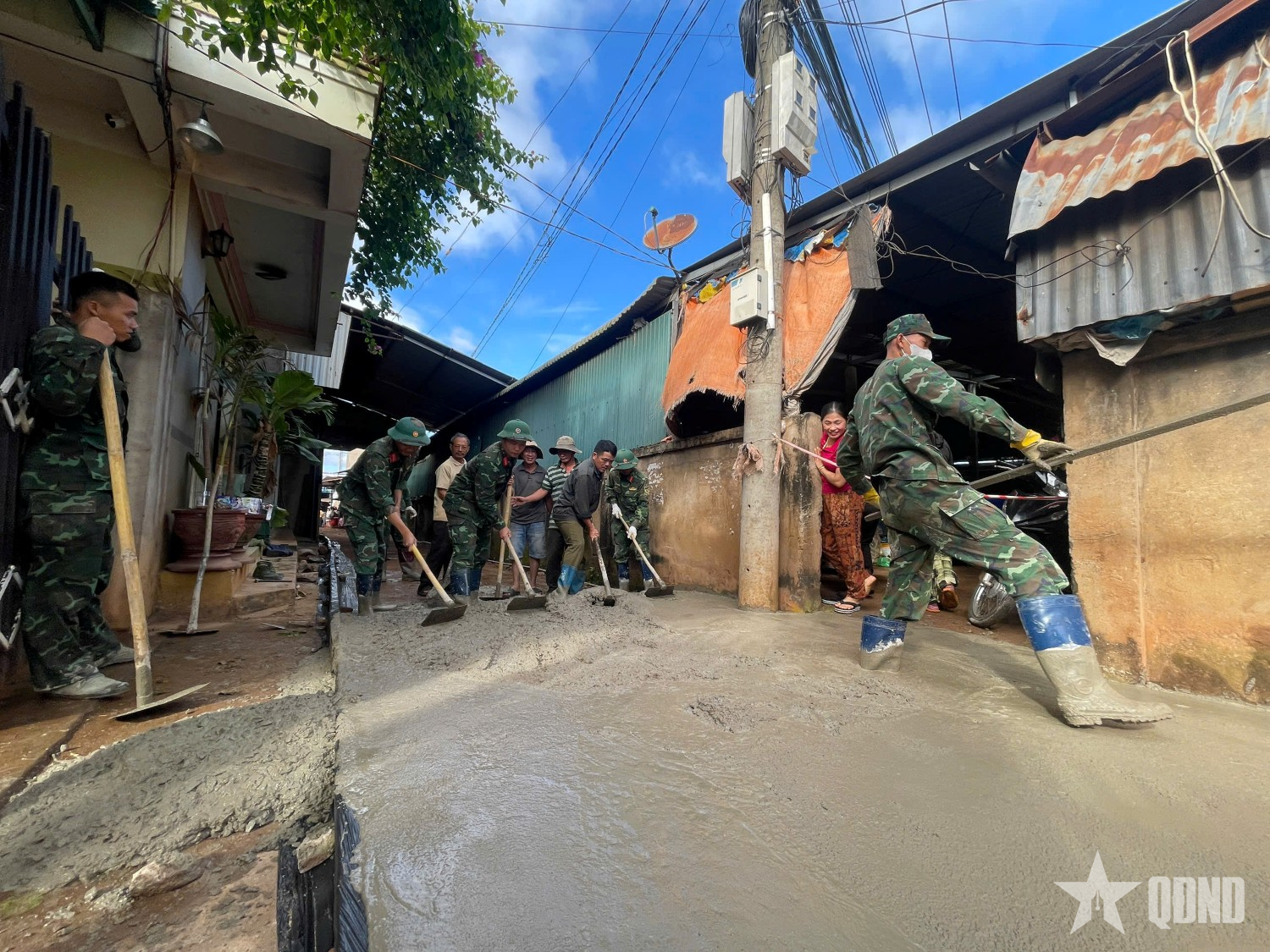 Cán bộ, chiến sĩ Trung đoàn 66 giúp nhân dân thôn 2B, xã Ea H’leo, tỉnh Đắk Lắk đổ đường bê tông.