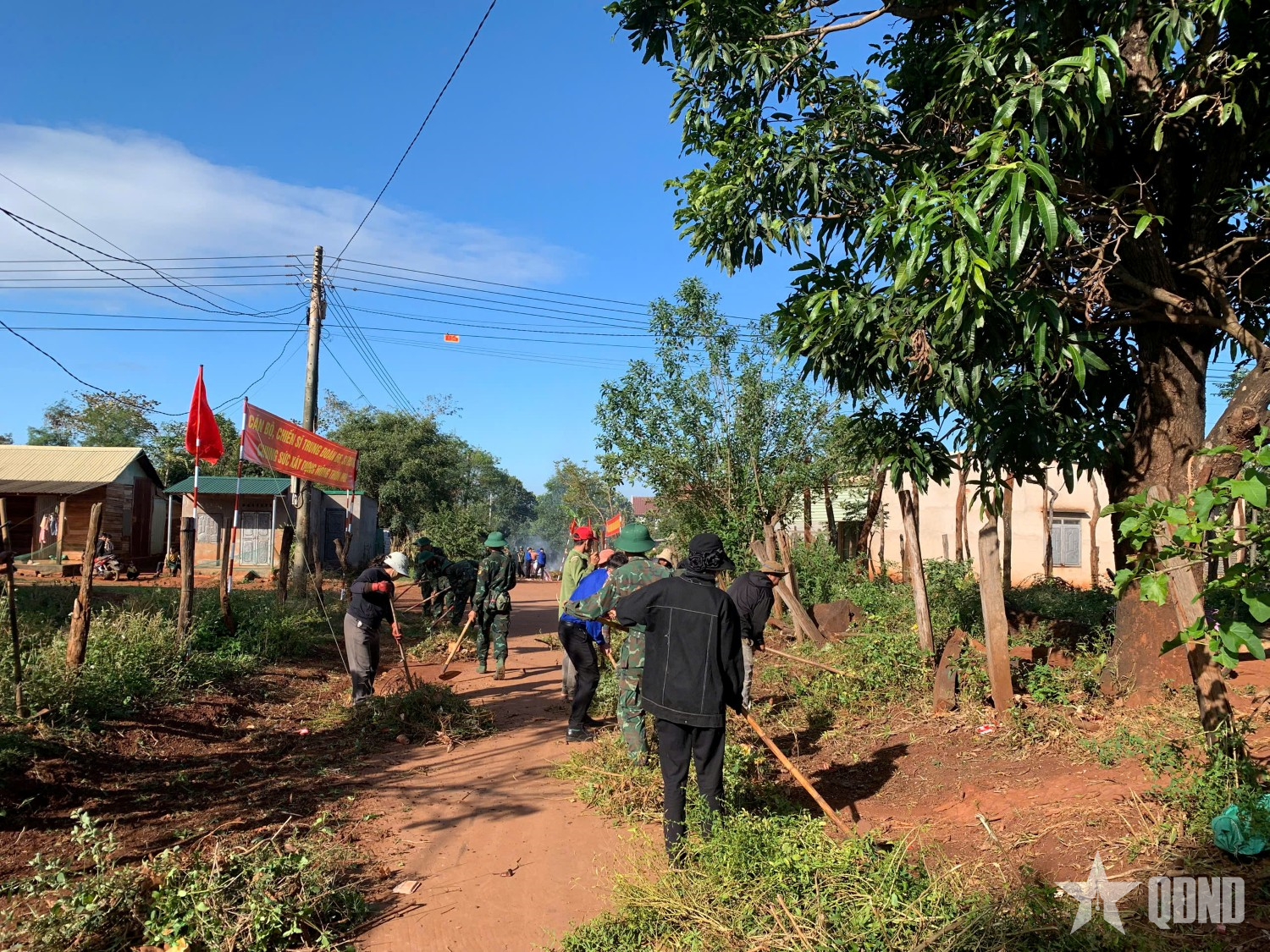 Cán bộ, chiến sĩ Trung đoàn 66 cùng với nhân dân địa phương vệ sinh đường làng.