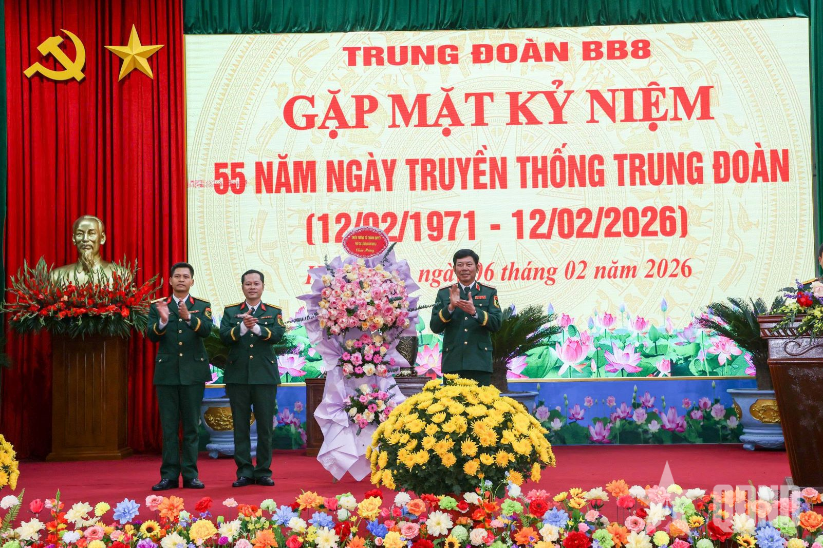 Thiếu tướng Tô Thành Quyết, Phó tư lệnh Quân khu 3 tặng hoa chúc mừng cán bộ, chiến sĩ Trung đoàn 8 nhân dịp gặp mặt kỷ niệm 55 năm Ngày truyền thống Trung đoàn.