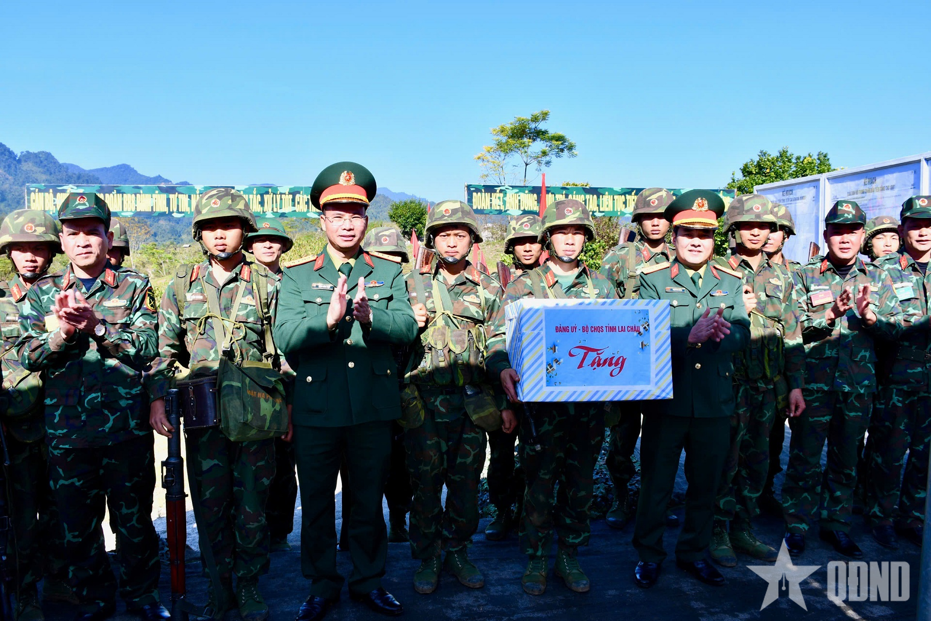 Lãnh đạo Bộ CHQS tỉnh Lai Châu tặng quà cho các lực lượng tham gia diễn tập thực binh.