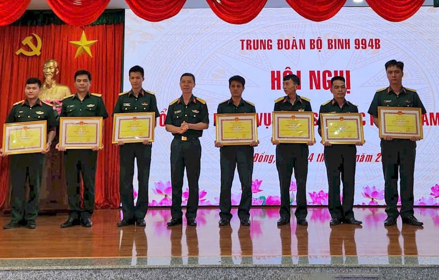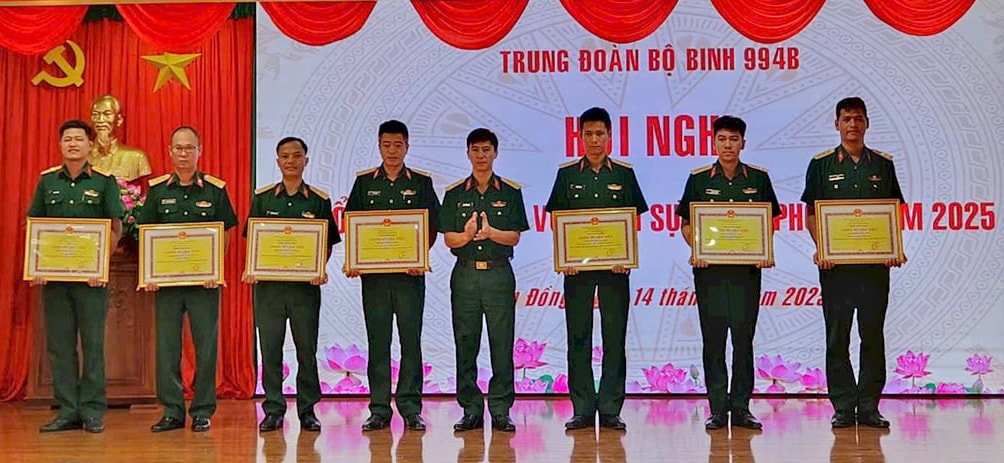 Thượng tá Đinh Tuấn Anh, Chính ủy Trung đoàn Bộ binh 994B trao giấy khen cho các tập thể, cá nhân đạt danh hiệu Chiến sĩ thi đua năm 2025