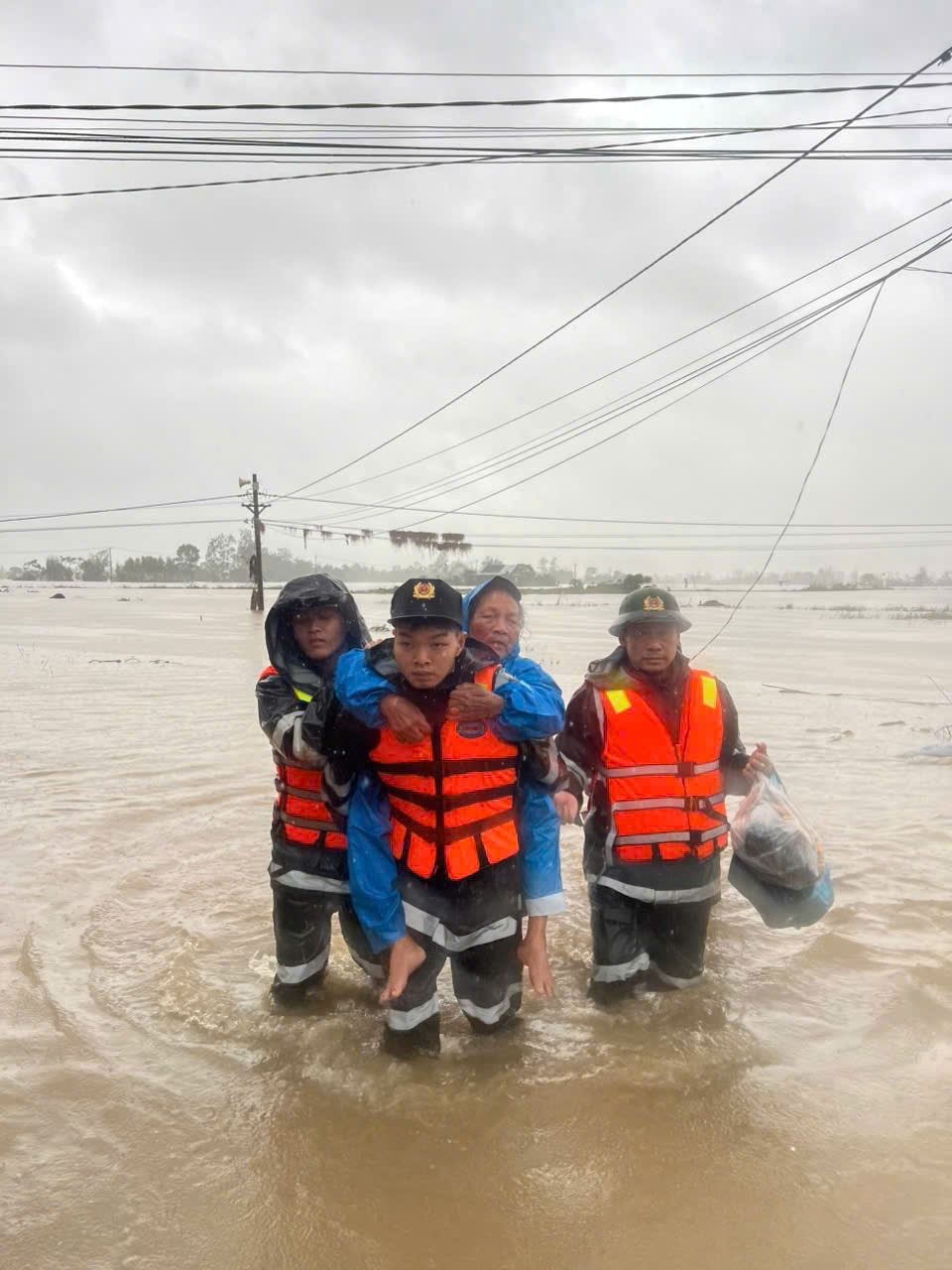 Các chiến sĩ hỗ trợ đưa người dân ra khỏi khu vực trũng thấp bị ngập, nguy hiểm, nước chảy xiết an toàn