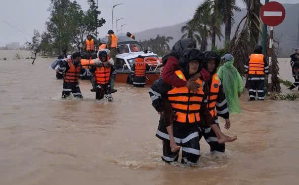 Trung đoàn CSCĐ Nam Trung Bộ tiếp cận các khu vực bị chia cắt, di chuyển người già, trẻ nhỏ, phụ nữ có thai... từ vùng nguy hiểm đến nơi an toàn.