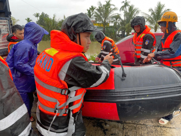 Tại 2 tỉnh Gia Lai và Khánh Hòa, nhiều khu vực dân cư, tuyến đường liên thôn, liên xã, các khu phố... bị ngập sâu, Trung đoàn CSCĐ Nam Trung Bộ, Bộ Tư lệnh CSCĐ đã kịp thời triển khai lực lượng phối hợp với chính quyền địa phương sử dụng xuồng máy chuyên dụng, phao và dây cứu hộ tiếp cận các khu vực bị chia cắt, di chuyển người già, trẻ nhỏ, phụ nữ mang thai từ vùng nguy hiểm đến nơi an toàn. Đồng thời, vận chuyển nhu yếu phẩm thiết yếu, nước uống, thuốc men, đèn pin… đến các hộ dân.