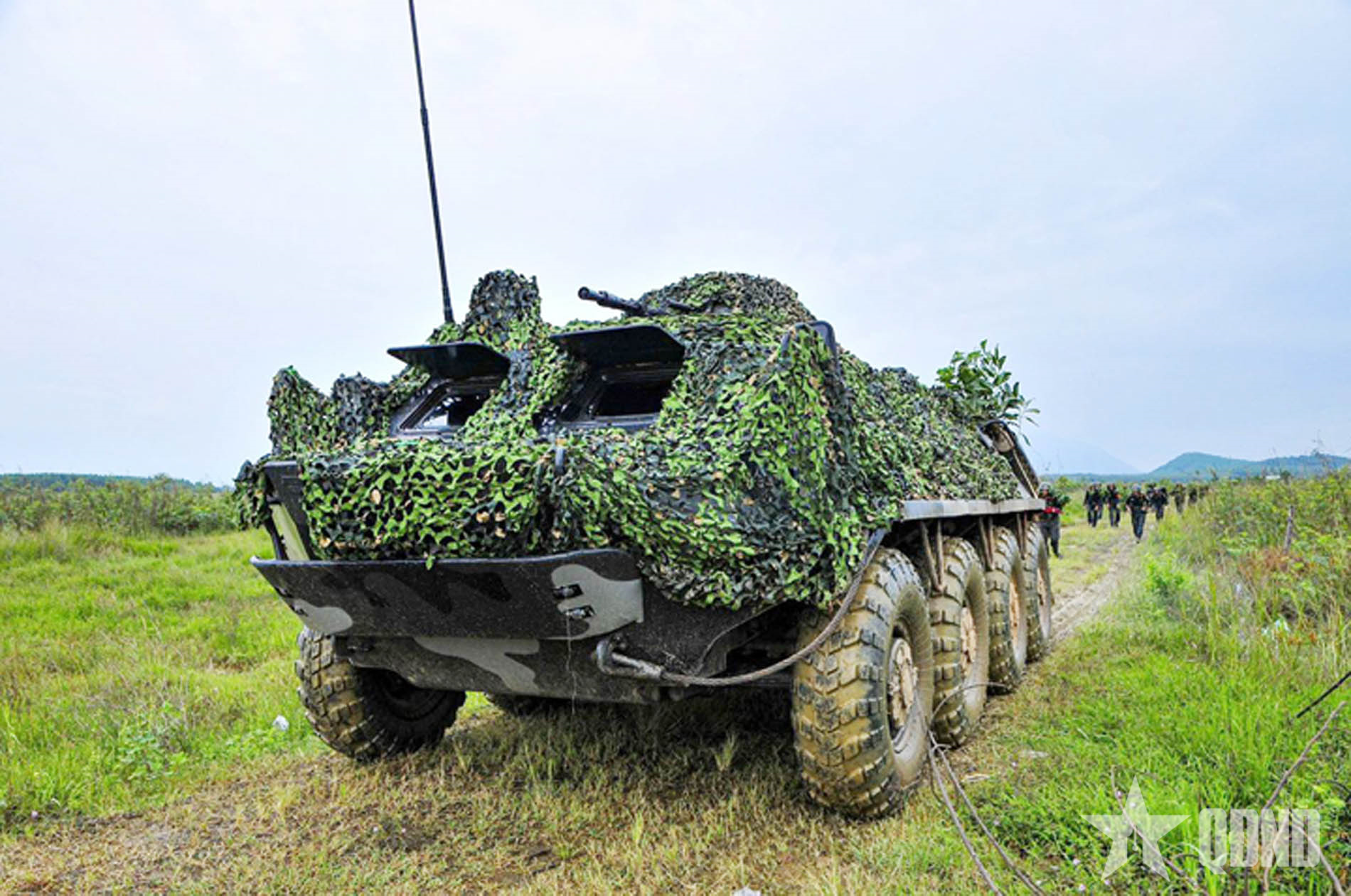 Xe thiết giáp và cán bộ, chiến sĩ thực hành tiêu diệt mục tiêu trong diễn tập.