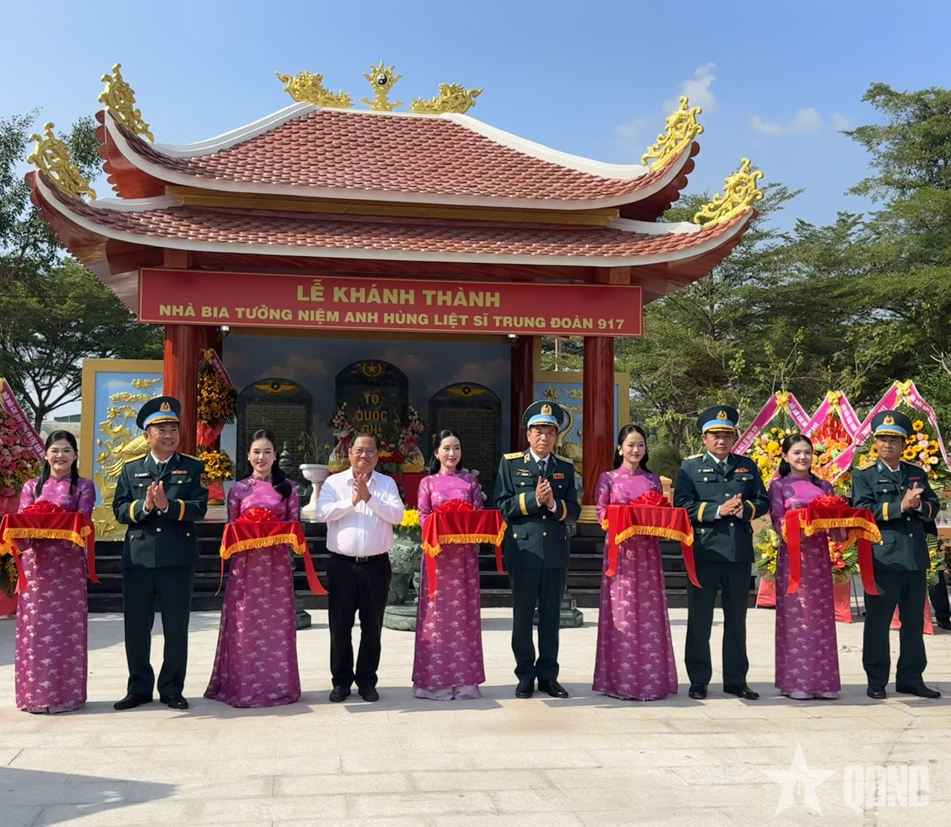 Các đại biểu thực hiện nghi thức khánh thành Nhà bia tưởng niệm Anh hùng liệt sĩ Trung đoàn 917.