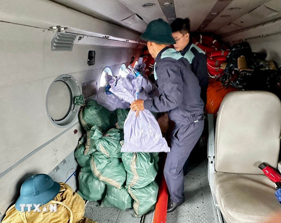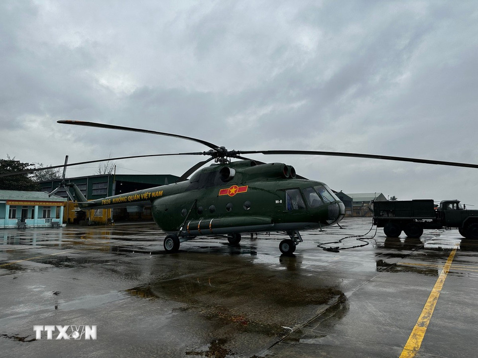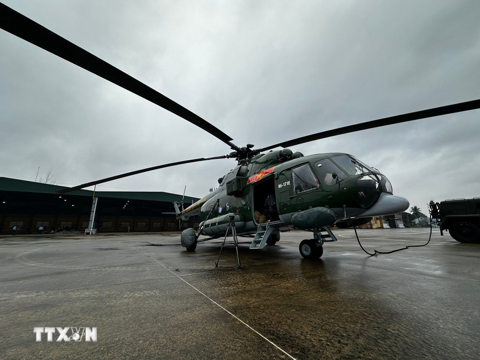 Trực thăng của Trung đoàn Không quân 930 sẵn sàng cất cánh chuyển hàng cứu trợ đến người dân các tỉnh Nam Trung Bộ. (Ảnh: Trần Lê Lâm/TTXVN)