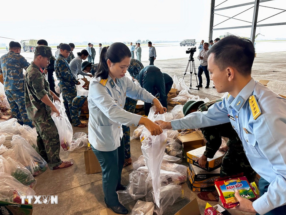 Lương thực, thực phẩm, nhu yếu phẩm được sắp xếp lên máy bay để chuyển đến người dân vùng lũ. (Ảnh: Trần Lê Lâm/TTXVN)