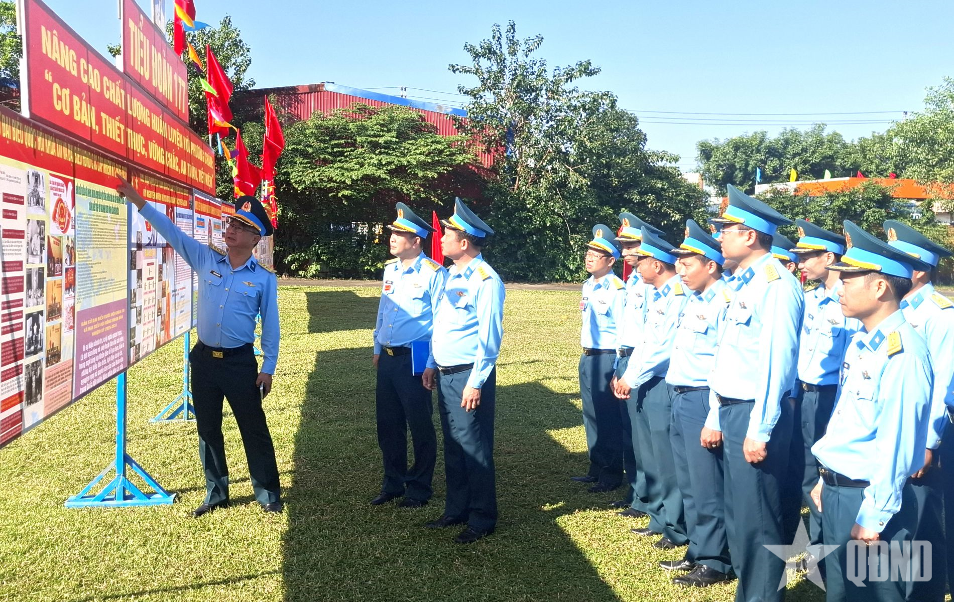 Lãnh đạo, chỉ huy Sư đoàn Phòng không 375 tham quan mảng tuyên truyền cổ động của Trung đoàn Tên lửa 282.