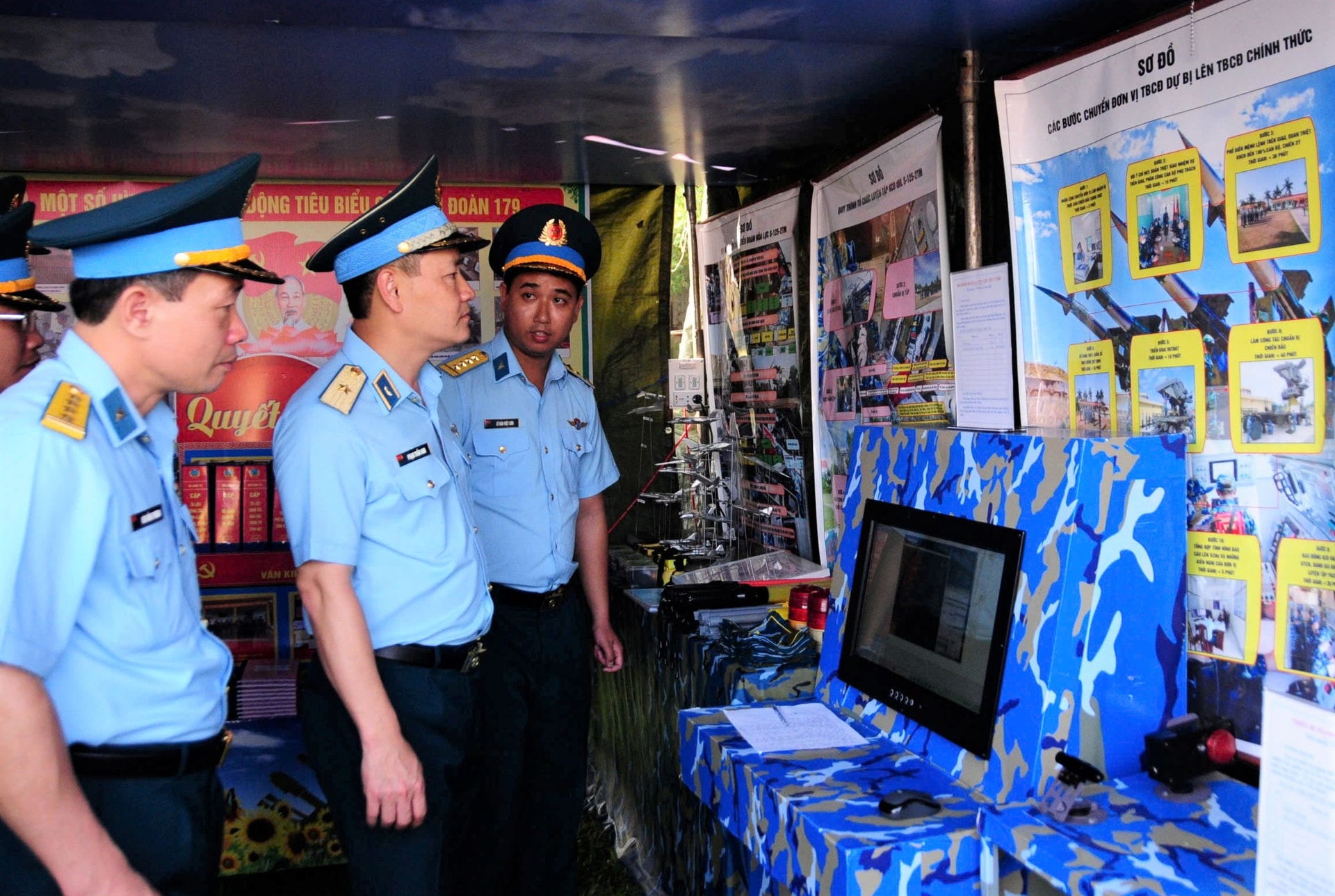 Thiếu tướng Phạm Tuấn Anh, Phó Tư lệnh Quân chủng Phòng không - Không quân (giữa) tham quan khu giới thiệu của tiểu đoàn thuộc Trung đoàn 282. Ảnh: ĐĂNG NGỌC