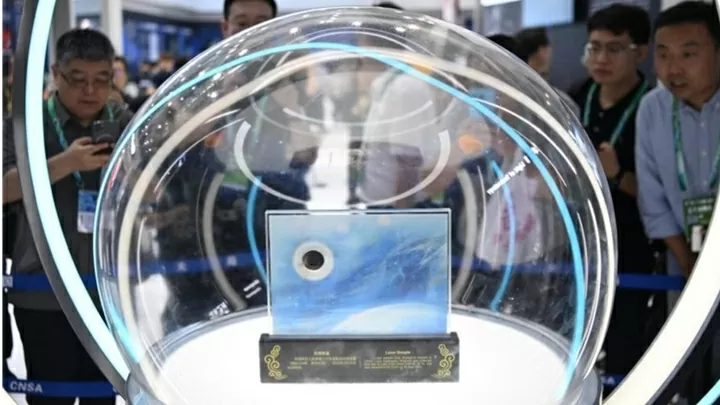 Du khách xem các mẫu vật Mặt trăng của tàu vũ trụ Chang'e 6 được thu thập từ phía xa của Mặt trăng, trưng bày tại triển lãm Hàng không và vũ trụ quốc tế Trung Quốc lần thứ 15 tại Chu Hải, tỉnh Quảng Đông (Trung Quốc), ngày 13/11/2024. (Nguồn: Tân Hoa xã)
