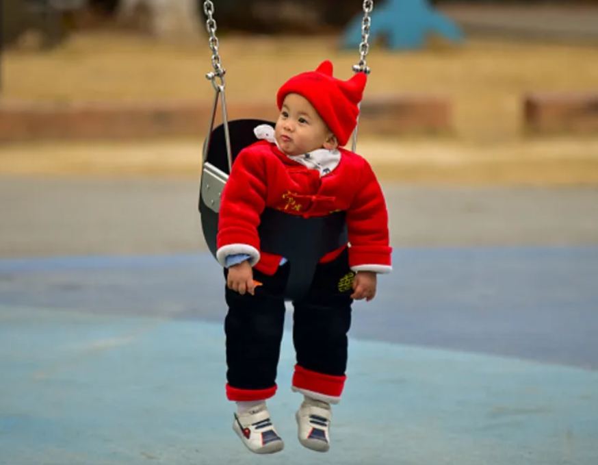 Em bé ngồi ghế đu trong công viên ở thành phố Fuyang, Trung Quốc. Ảnh: Getty Images