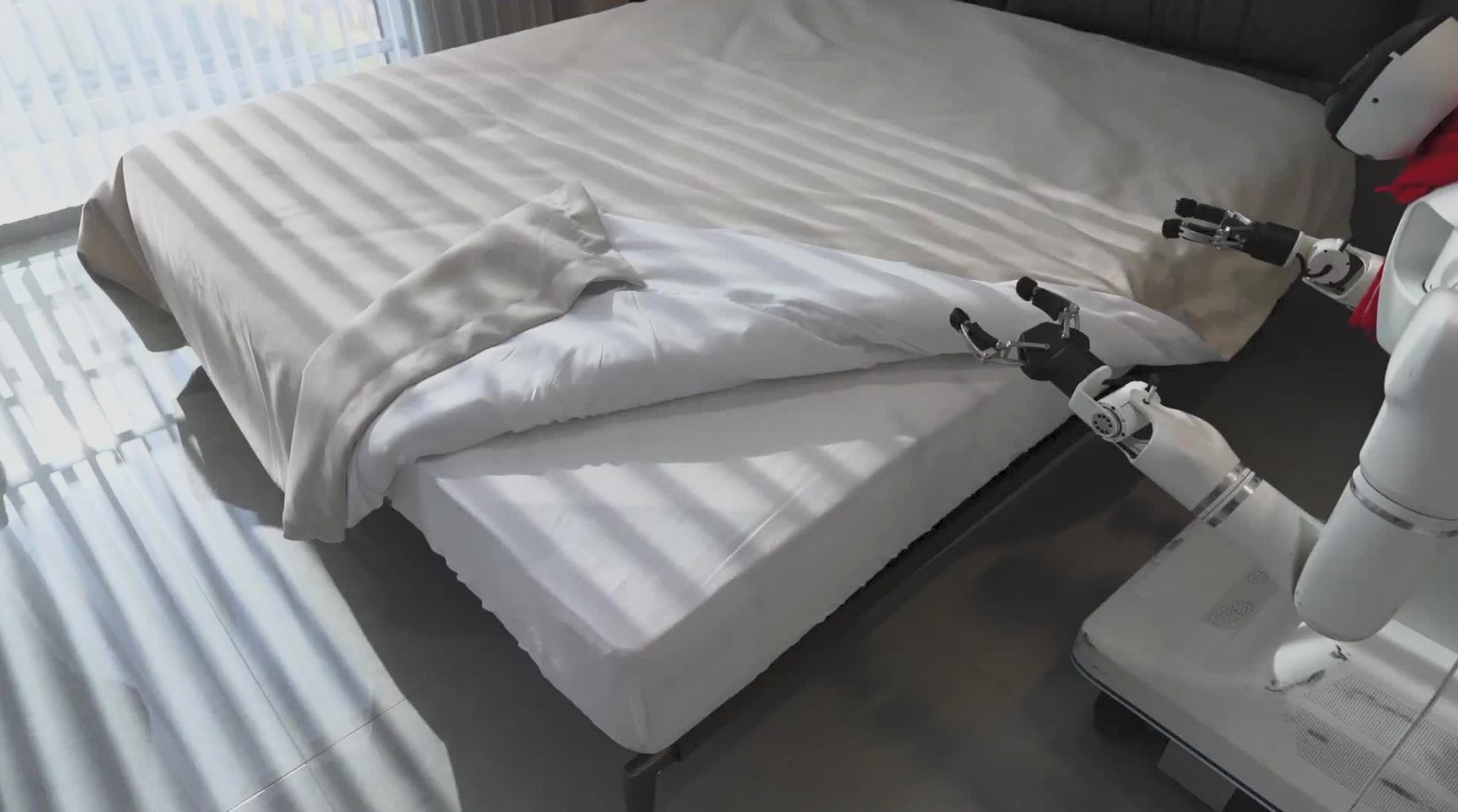 Fred Yang trình diễn cách robot hình người Panther có thể di chuyển bằng bánh xe để chỉnh sửa những tấm ga trải giường lộn xộn