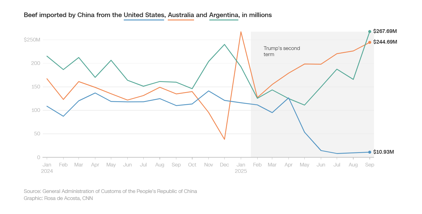Từ tháng 1 đến tháng 7, Bắc Kinh chỉ mua 481 triệu USD thịt bò Mỹ, tương đương 8% tổng xuất khẩu của Mỹ – giảm gần một nửa so với cùng kỳ năm ngoái, khi tỷ lệ này còn ở mức 15%. Đến tháng 9, bức tranh càng ảm đạm hơn: kim ngạch chỉ đạt 11 triệu USD, tức giảm 90% so với mức 110 triệu USD của cùng tháng năm trước.