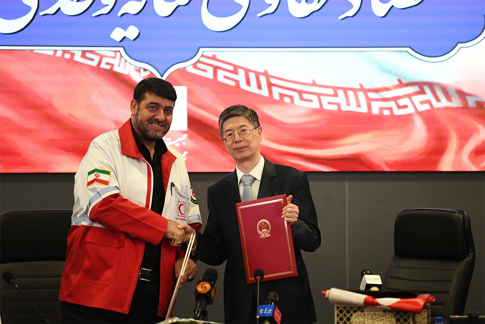 Đại sứ Trung Quốc tại Iran Cong Peiwu (bên phải) và Chủ tịch Hội Trăng lưỡi liềm Đỏ Iran (IRCS) Pirhossein Kolivand tại lễ ký giấy chứng nhận bàn giao viện trợ nhân đạo khẩn cấp của Trung Quốc cho Iran, ngày 15-4. Ảnh: Tân Hoa xã