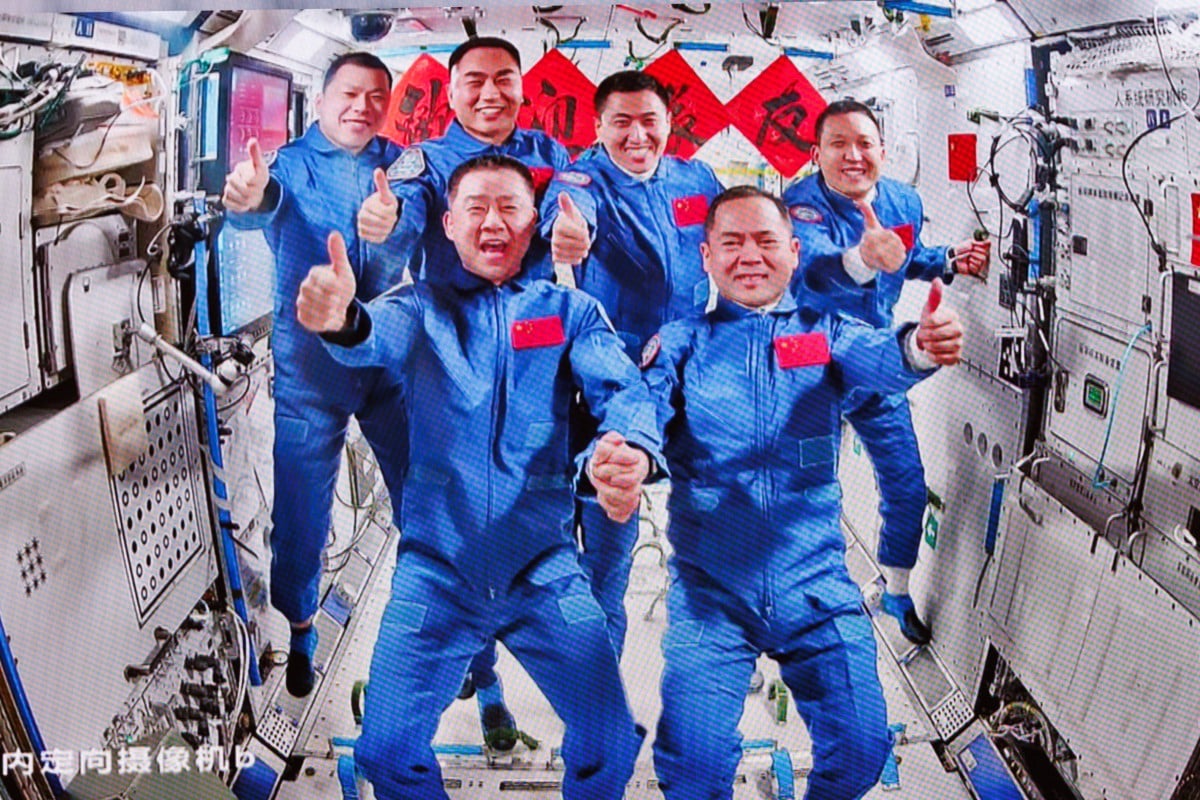 Phi hành đoàn Thần Châu-20 và Thần Châu-21 chụp chung trên trạm vũ trụ Thiên Cung ngày 1/11. Ảnh: THX