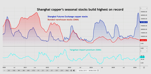 Tại thị trường nội địa, tồn kho trên Sàn Giao dịch Kỳ hạn Thượng Hải (ShFE) đã ghi nhận mức tăng vượt xa thông lệ mùa vụ. Đỉnh tồn kho đạt hơn 433.000 tấn vào đầu tháng 3, cao hơn nhiều so với mức 268.000 tấn của cùng kỳ năm ngoái.