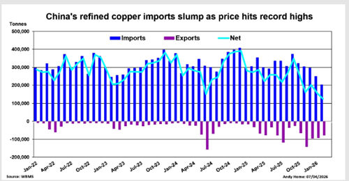 Theo số liệu từ Cục Thống kê Kim loại Thế giới, nhập khẩu ròng đồng tinh luyện của Trung Quốc trong tháng 2 chỉ đạt 125.350 tấn, đánh dấu mức thấp nhất kể từ tháng 4/2011. Diễn biến này diễn ra trong bối cảnh giá đồng kỳ hạn giao 3 tháng trên Sàn Giao dịch Kim loại London (LME) từng xác lập kỷ lục 14.527,50 USD/tấn.