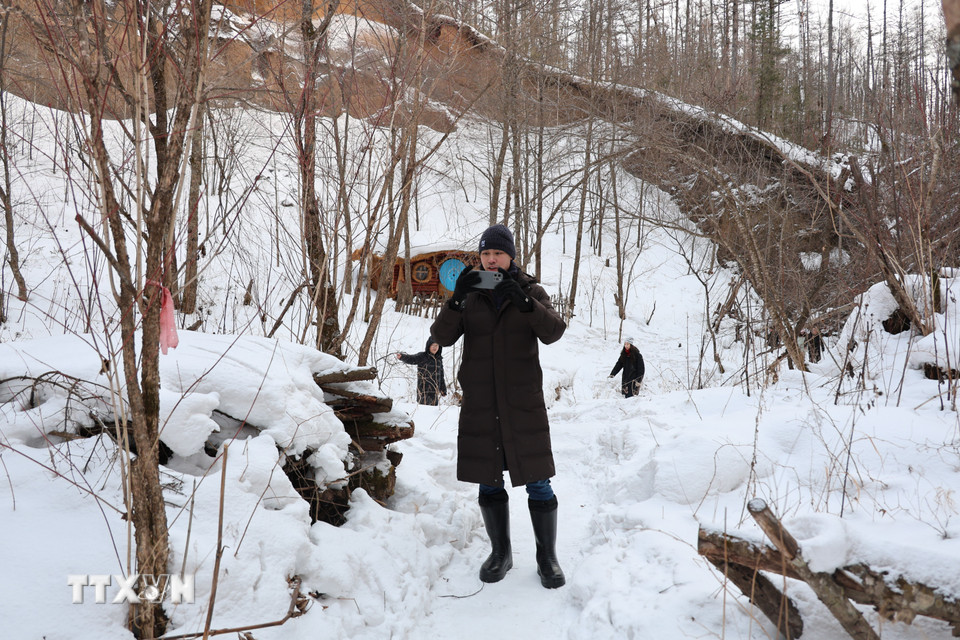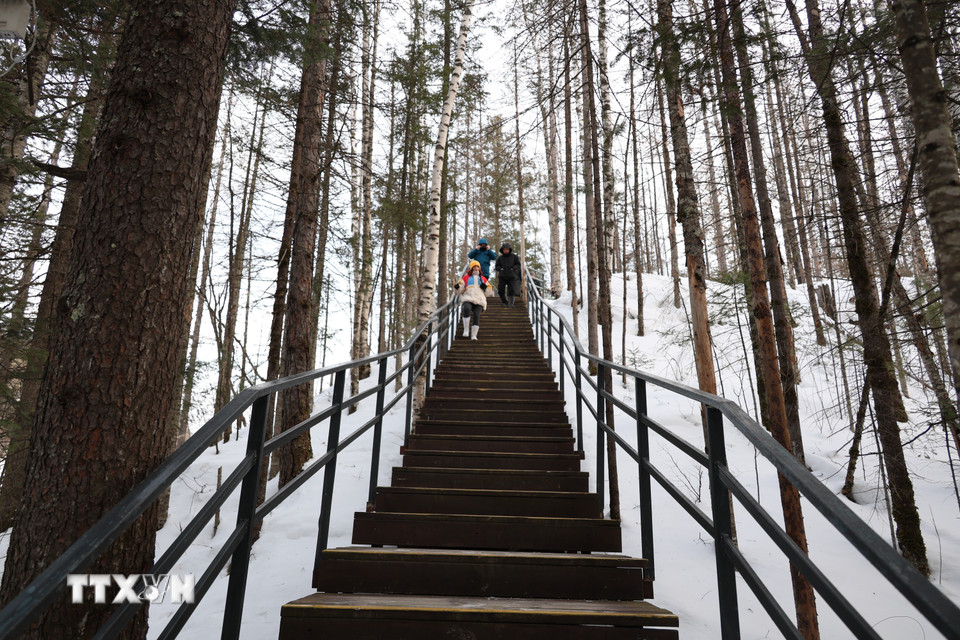 Cây cầu gỗ chạy dọc theo sườn núi, giúp du khách có thể di chuyển thuận tiện trong trời tuyết. (Ảnh: Quang Hưng/TTXVN)