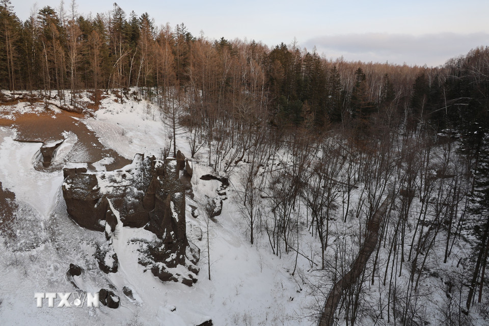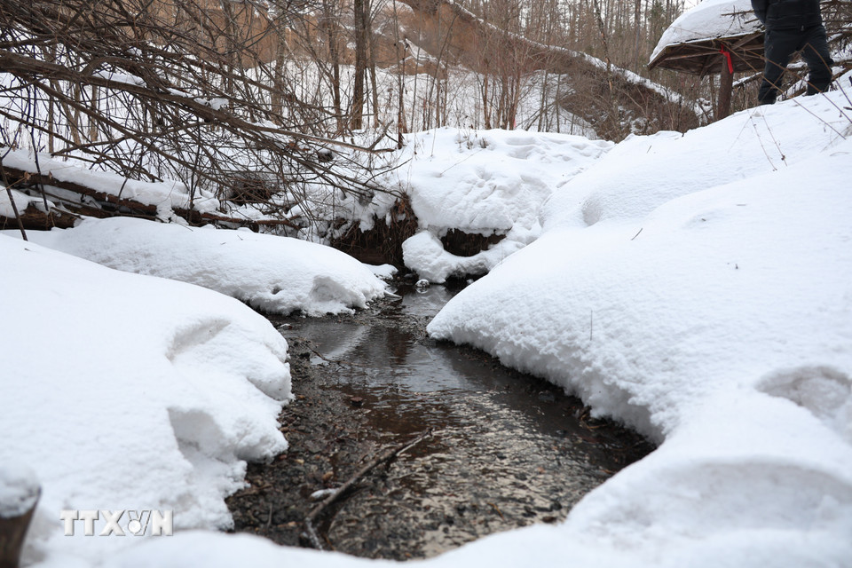 Dòng suối nước nóng chảy dưới chân núi Trường Bạch Sơn, giúp xoa tan bớt giá lạnh. (Ảnh: Quang Hưng/TTXVN)
