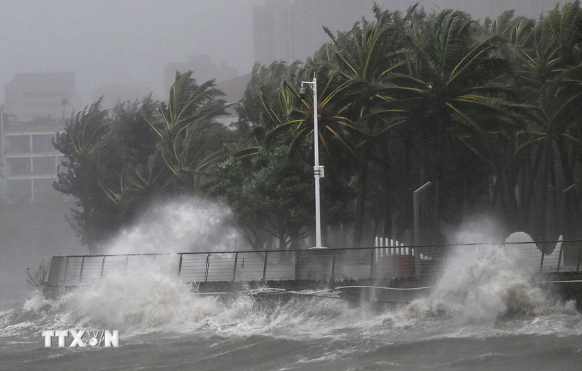 Sóng biển dâng cao khi bão Matmo đổ bộ vào Hải Khẩu, tỉnh Hải Nam, Trung Quốc ngày 5/10. (Ảnh: THX/TTXVN)