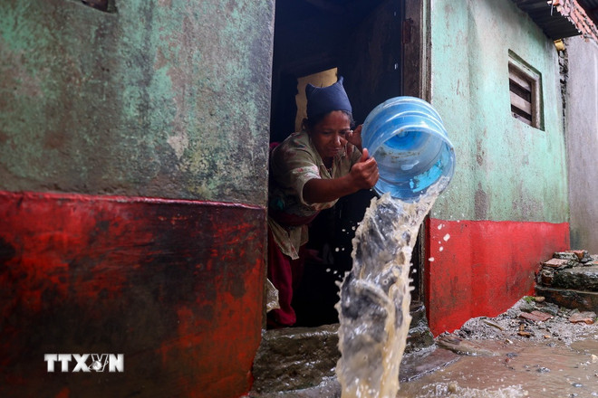 Người dân tát nước khỏi ngôi nhà bị ngập sau những trận mưa lớn tại Kathmandu, Nepal, ngày 5/10. (Ảnh: THX/TTXVN)