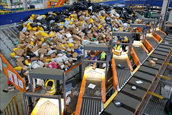 Nhân viên phân loại các đơn hàng tại trung tâm logistics ở Sơn Đông, Trung Quốc. Ảnh: THX/TTXVN