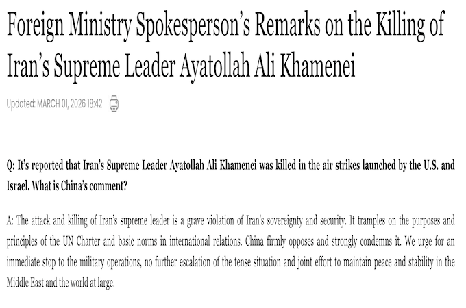Hãng thông tấn Anadolu của Thổ Nhĩ Kỳ cho biết trong một thông cáo đăng trên nền tảng mạng xã hội X ngày 1/3, Bộ Ngoại giao Trung Quốc tuyên bố: “Cuộc tấn công và việc sát hại Lãnh tụ Tối cao Iran là sự vi phạm nghiêm trọng chủ quyền và an ninh của Iran”