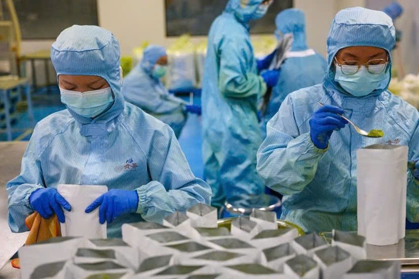 Công nhân tại nhà máy matcha ở tỉnh Quý Châu đang chế biến và đóng gói sản phẩm. Ảnh: Tân Hoa Xã.