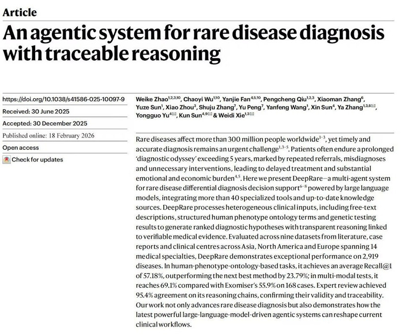 Một nhóm nghiên cứu do các giáo sư Tôn Khôn và Dư Vĩnh Quốc thuộc Bệnh viện Tân Hoa trực thuộc Trường Y Đại học Giao thông Thượng Hải dẫn đầu, phối hợp với nhóm của giáo sư Trương Á và Phó Giáo sư Tạ Vĩ Địch từ Đại học Giao thông Thượng Hải, đã phát triển thành công DeepRare, hệ thống trí tuệ nhân tạo (AI) chẩn đoán bệnh hiếm gặp đầu tiên trên thế giới với "quy trình suy luận có thể truy vết".