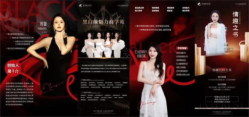 Một số nội dung thậm chí dùng danh xưng như “chuyên viên trị liệu người lớn” hay “cố vấn giới tính” để quảng bá, nhưng có yếu tố gợi cảm hoặc ám chỉ tình dục. Một số chương trình còn quảng cáo “khóa đánh thức ham muốn” hay “36 kỹ nghệ trên giường” với giá hàng chục nghìn NDT, mở tại Thâm Quyến, Thái Lan hoặc Hàng Châu.