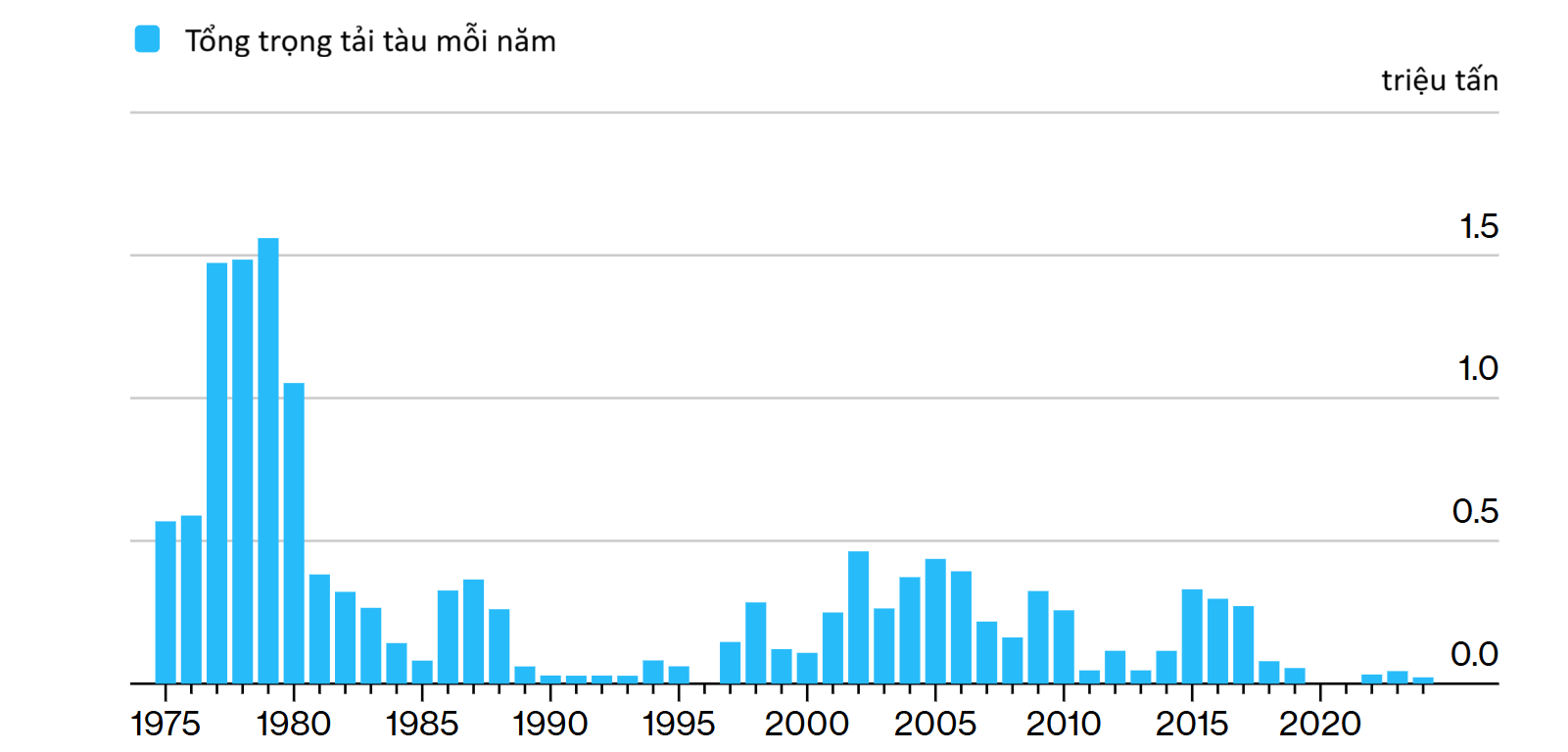 Tổng trọng tải các tàu được đóng tại Mỹ giảm mạnh so với thập niên 70 của thế kỷ trước. Đồ họa: Bloomberg.