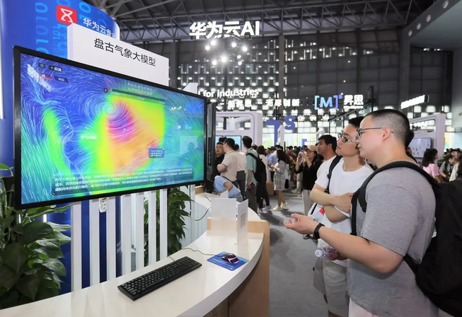 Khách tham quan tìm hiểu về mô hình Pangu-Weather AI của Huawei trong Hội nghị Trí tuệ Nhân tạo Thế giới (WAIC) 2023 ở Thượng Hải. Ảnh: Tân Hoa Xã