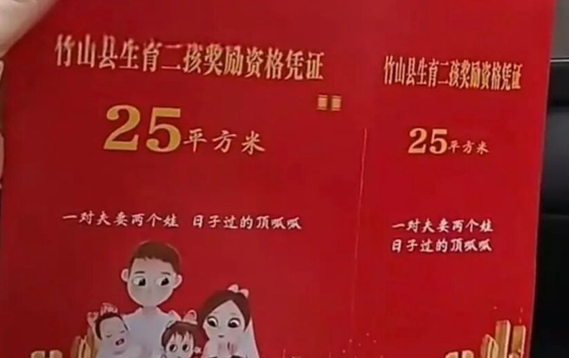 Giấy chứng nhận thưởng 25 mét vuông nhà cho cặp vợ chồng sinh con thứ hai. Ảnh: Guancha.