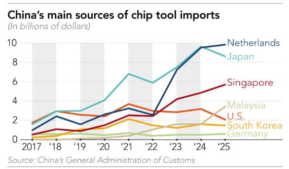 Trong khi đó, vai trò của Nhật Bản và Hà Lan vẫn cực kỳ vững chắc. Từ năm 2020 đến 2025, tổng giá trị nhập khẩu thiết bị chip của Trung Quốc từ Nhật Bản đã vượt mốc 42 tỉ USD, theo sát là Hà Lan với 35 tỉ USD. Nhật Bản là quê hương của các tên tuổi lừng lẫy như Tokyo Electron, Screen Semiconductor Solutions và Ebara, đóng góp hơn 40% doanh thu cho Tokyo Electron trong năm tài chính 2025. Về phần mình, Hà Lan sở hữu ASML, nhà sản xuất thiết bị chip lớn nhất thế giới, cùng các nhà cung cấp chủ chốt khác như ASM và Besi, mang về cho ASML tỷ trọng doanh thu 29,1% từ thị trường Trung Quốc.