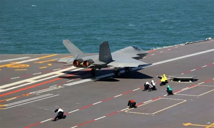 Tiêm kích hạm J-35 cất cánh từ tàu sân bay Phúc Kiến trong ảnh công bố ngày 22/9. (Nguồn: Tân Hoa xã)