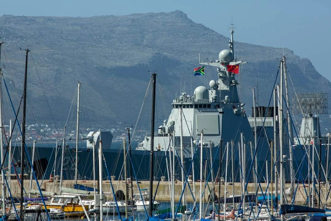 Cờ Trung Quốc và Nam Phi tung bay trên tàu khu trục CSN Tangshan của Hải quân Trung Quốc neo ở cảng Simons Town của Nam Phi ngày 7/1. (Nguồn: Bloomberg)