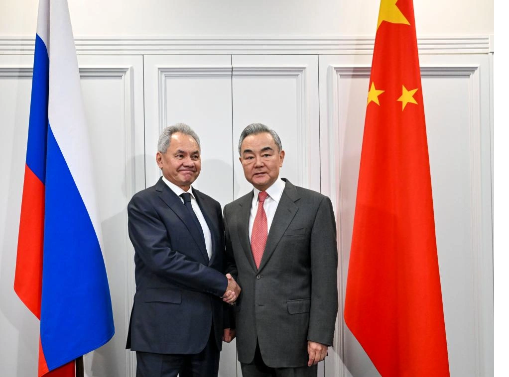 Bộ trưởng Ngoại giao Trung Quốc Vương Nghị và Thư ký Hội đồng An ninh Liên bang Nga Sergei Shoigu. Ảnh: Xinhua.