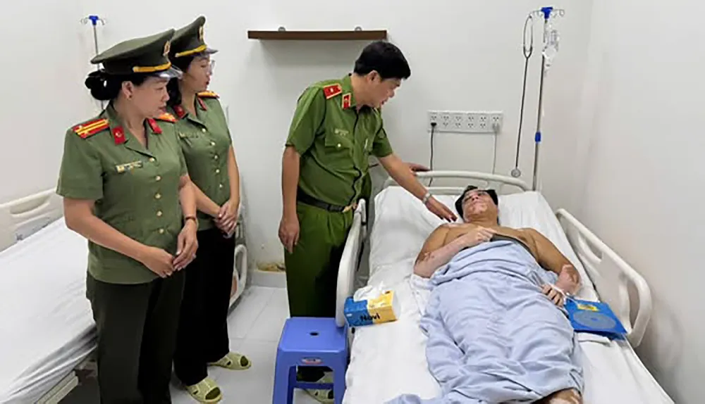 Thiếu tướng Nguyễn Thanh Hưởng, Phó Giám đốc Công an TP.HCM thăm hỏi, động viên trung tá Minh. Ảnh: CA