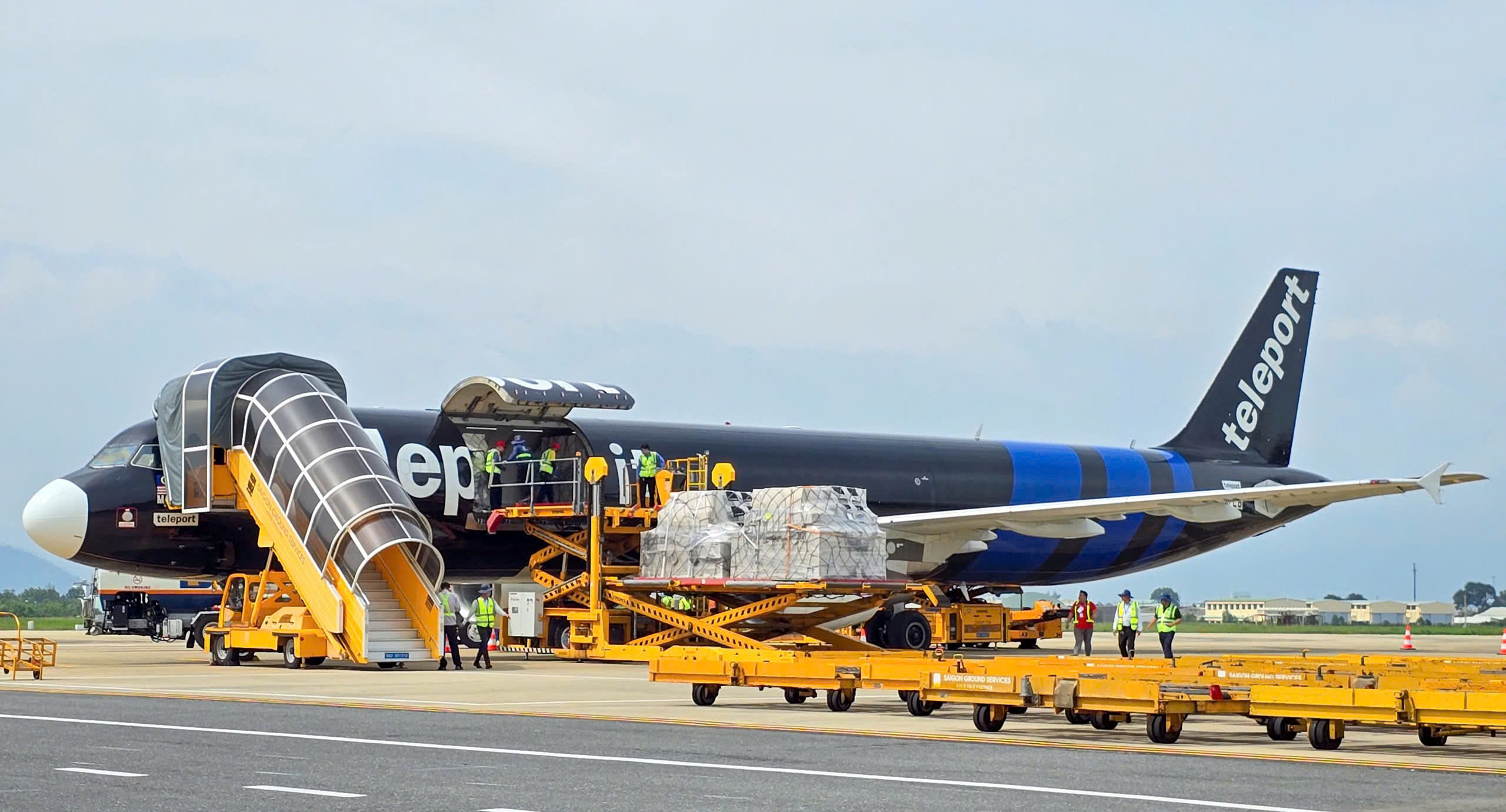 Hàng hóa viện trợ của Trung tâm AHA được đưa từ máy bay xuống Sân bay quốc tế Đà Nẵng